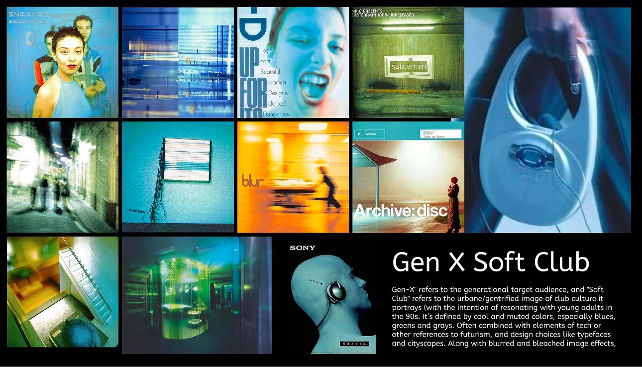 يشير مصطلح “Gen X” إلى الفئة الجيلية المستهدفة، بينما يشير “Soft Club” إلى الصورة الحضرية والمُهذّبة لثقافة النوادي التي سعت إلى مخاطبة الشباب في التسعينيات. تتميّز هذه الجمالية بألوان باردة ومطفأة، خصوصًا الأزرق والأخضر والرمادي، وغالبًا ما تُدمج بعناصر تقنية أو إشارات إلى المستقبل، من خلال الخطوط، والمشاهد الحضرية، والتأثيرات البصرية مثل التمويه والتبييض