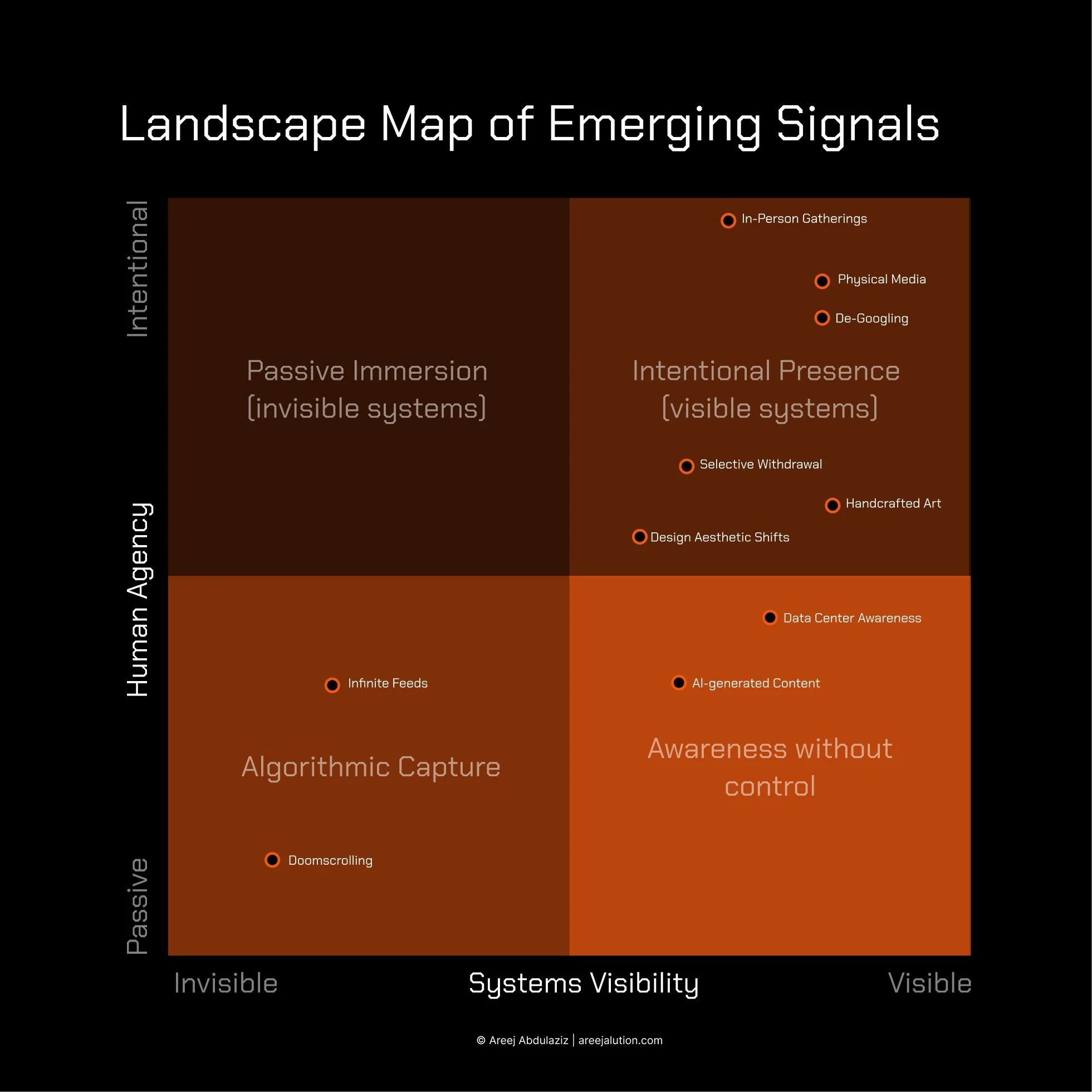 عندما نتراجع خطوة إلى الوراء وننظر إلى هذه الإشارات مجتمعة، يبدأ نمط أوسع بالظهور. ما نراه هنا ليس رفضًا للتكنولوجيا، ولا عودة بسيطة إلى صيغ قديمة. بل استجابة لأنظمة أصبحت أكثر تجريدًا، وأكثر أتمتة، وأصعب على الأفراد في فهم منطقها أو تتبع تأثيراتها. التكلفة البيئية، والمحتوى المُصنَّع، واستخراج البيانات، وتوحيد التصميم ليست قضايا منفصلة. بل هي نتائج مترابطة للمنطق نفسه: منطق التسارع المستمر